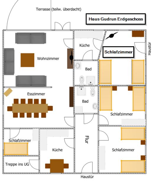 Durch die Raumaufteilung mit einem separaten Einzelzimmer eignet sich das Haus Gudrun auch sehr gut für Lebenshilfen, betreute Gruppen oder andere Einrichtungen. Die Kombination aus Gemeinschaftsflächen und klar getrennten Schlafbereichen ermöglicht sowohl Zusammenhalt als auch individuelle Rückzugsmöglichkeiten.