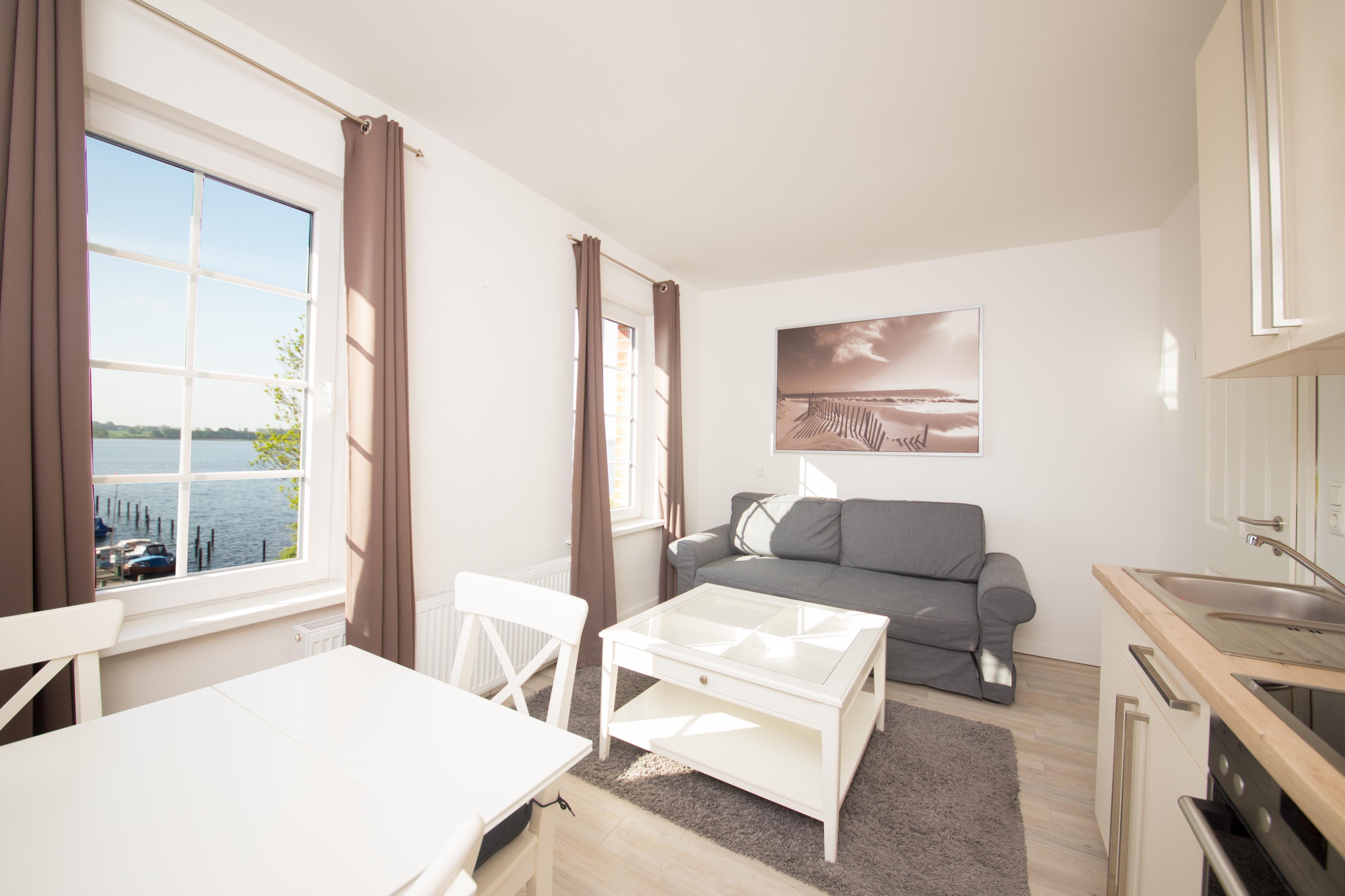 Wohnen mit Panorama: Der weitläufige Wohn- und Essbereich ist das Herzstück der Wohnung. Durch die Fenster blicken Sie direkt auf das glitzernde Wasser der Schlei. Die gemütliche Schlafcouch bietet bei Bedarf Platz für zwei weitere Personen. WLAN und Flachbild-TV sind selbstverständlich vorhanden.
