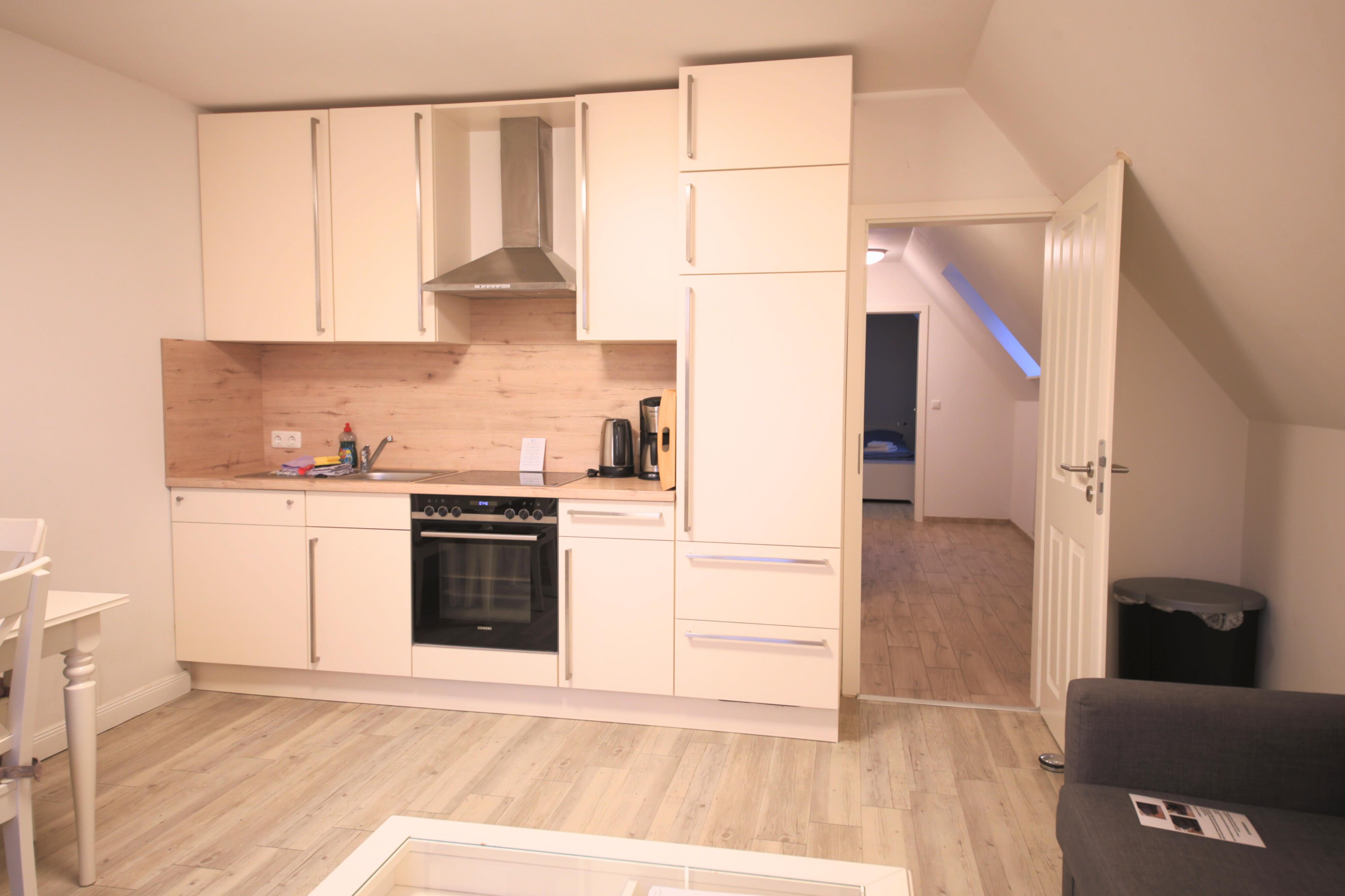Moderne Einbauküche: Die Küche ist voll ausgestattet und verfügt neben einem E-Herd und Backofen auch über einen praktischen Geschirrspüler sowie Kaffeemaschine, Toaster und Wasserkocher.